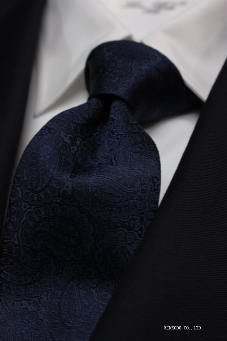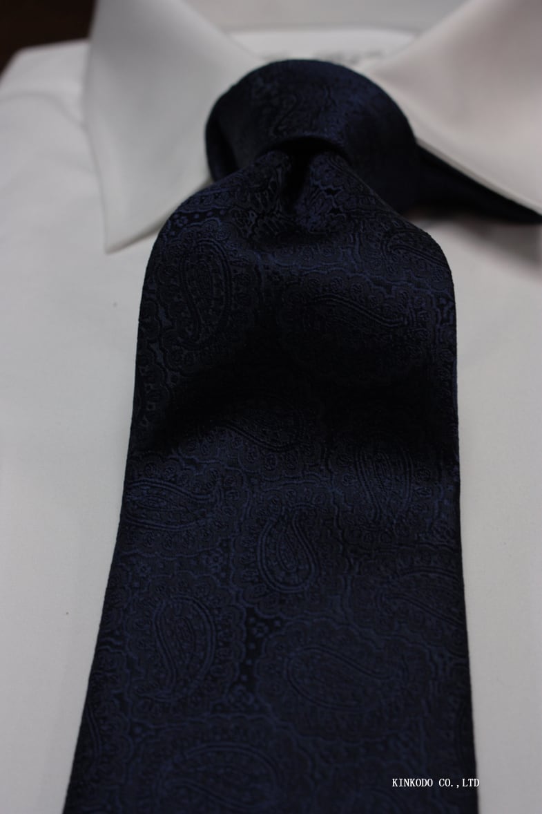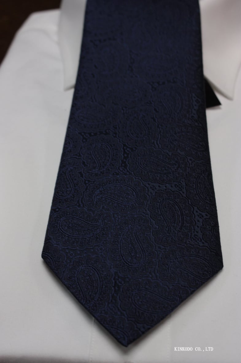 Albeni の中でも最高ランクに位置づけられる「PLUS」ラインの一本。濃紺のジャカードに極細のペイズリーをトーン・オン・トーンで織り出し、光の角度で柄が静かに浮かび上がります。ノットを作ると立体感と陰影があらわれ、ドレスからビジネスまで上質な存在感を演出。場面を選ばず締めるほどに良さが伝わる、長く使えるネイビータイです。
