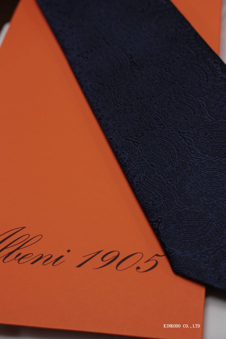 "アルベニ 1905" のタイは、コモ、ビエッラ産の上質な生地を使い、アルティジャンのハンドワークで1本ずつ仕上げられており、滑らかな質感、しっかりとした締め心地が特徴的です。