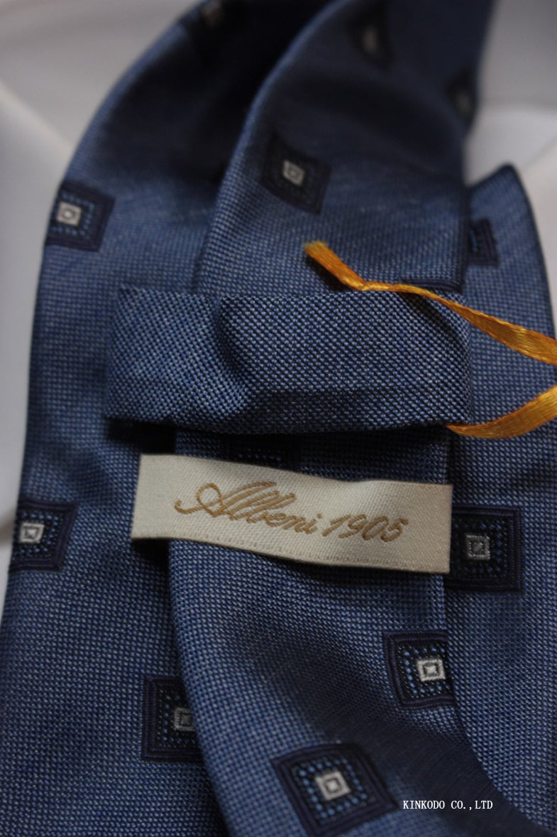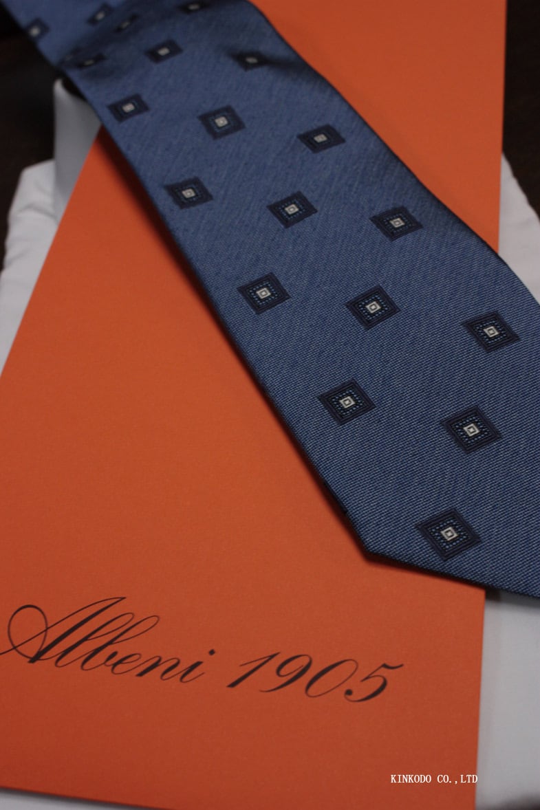 "アルベニ 1905" のタイは、コモ、ビエッラ産の上質な生地を使い、アルティジャンのハンドワークで1本ずつ仕上げられており、滑らかな質感、しっかりとした締め心地が特徴的です。