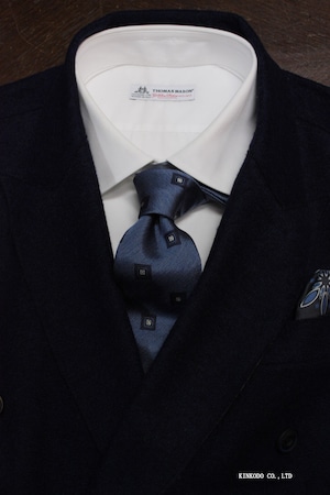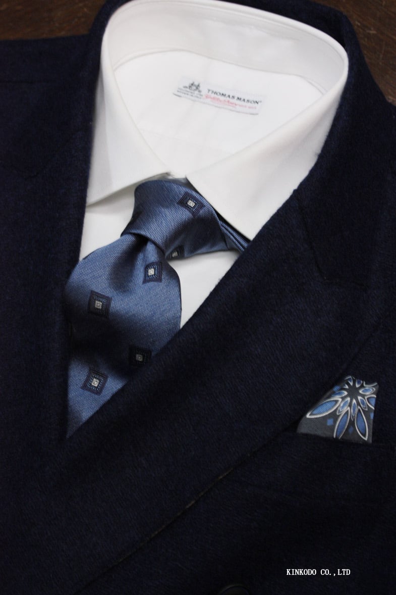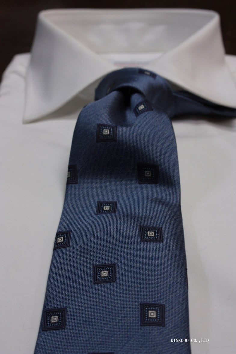 スモーキーブルーの地にネイビー×ライトグレーの正方形モチーフを散りばめ、上品で知的な印象に仕上げています。微細な織り組織によるほのかなメランジ感が奥行きを生み、光の加減で表情が変化。結び目はふっくらと立体的にまとまり、ディンプルも美しく決まります。タグに記された “Carefully Handmade” の名の通り、丁寧な仕立てでビジネスからフォーマルまで幅広く対応。ネイビーやグレーのスーツ、白やサックスのシャツと相性抜群の、使い勝手のよい一本です。