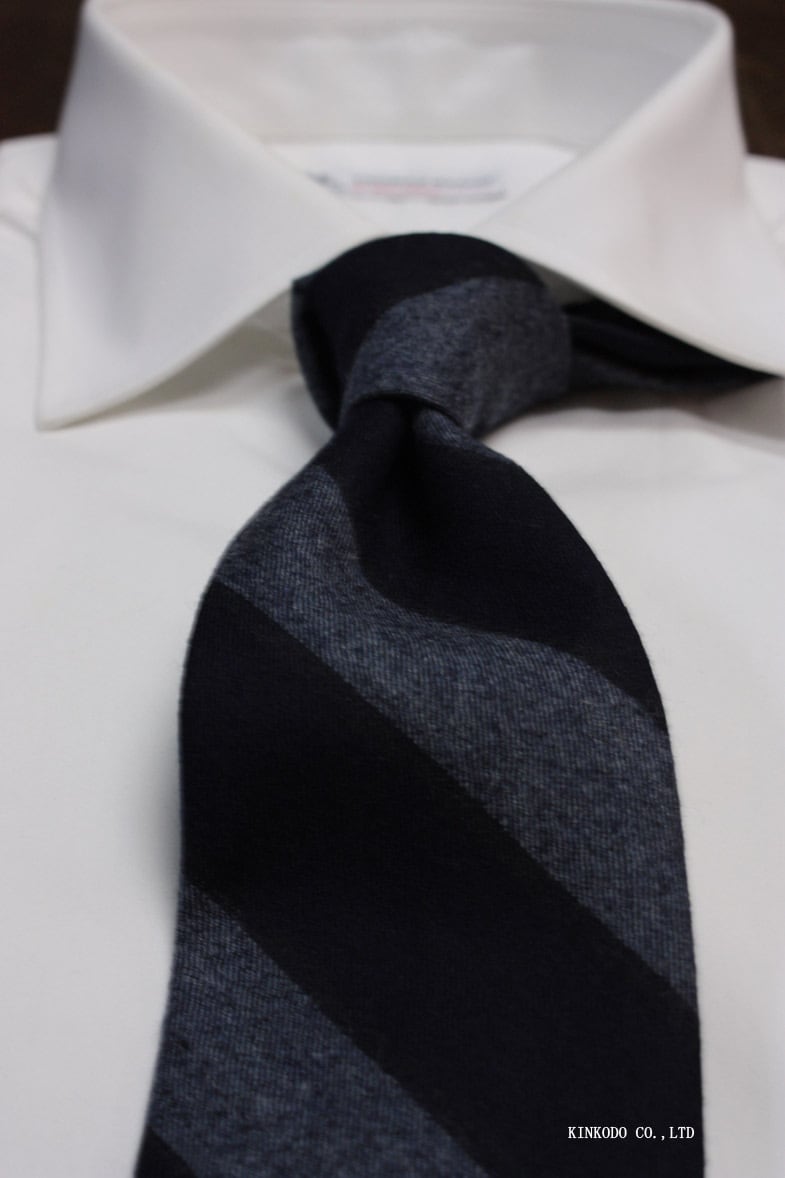 ・素材感と季節:フランネルや梳毛フランネルを用いたタイは**秋冬(〜早春)**に最適。起毛感または軽い毛羽立ちがあり、艶を抑えた上品な表情。ネイビー等の無地・プリンスオブウェールズなどが定番です。