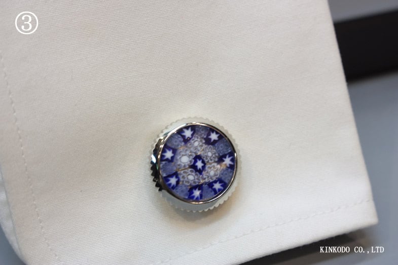 色ガラスのようなモザイクが煌めく――袖口に遊び心を添える丸型カフス。