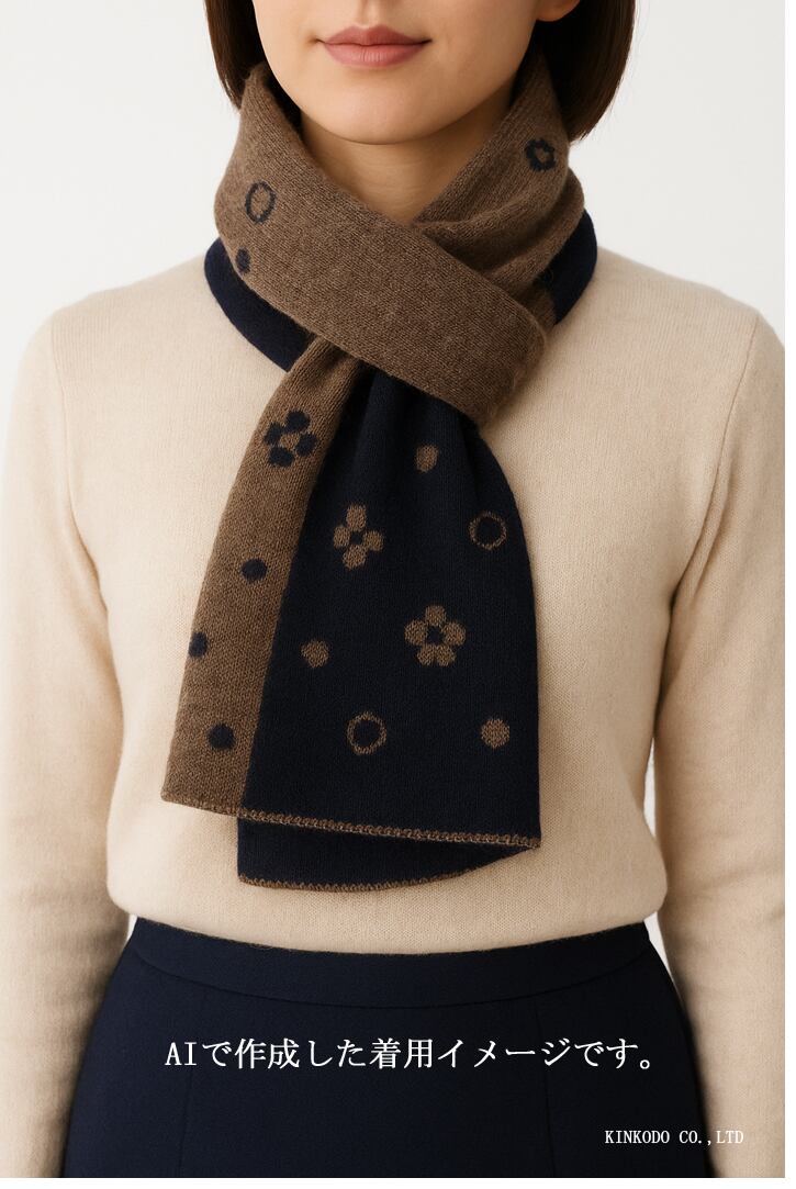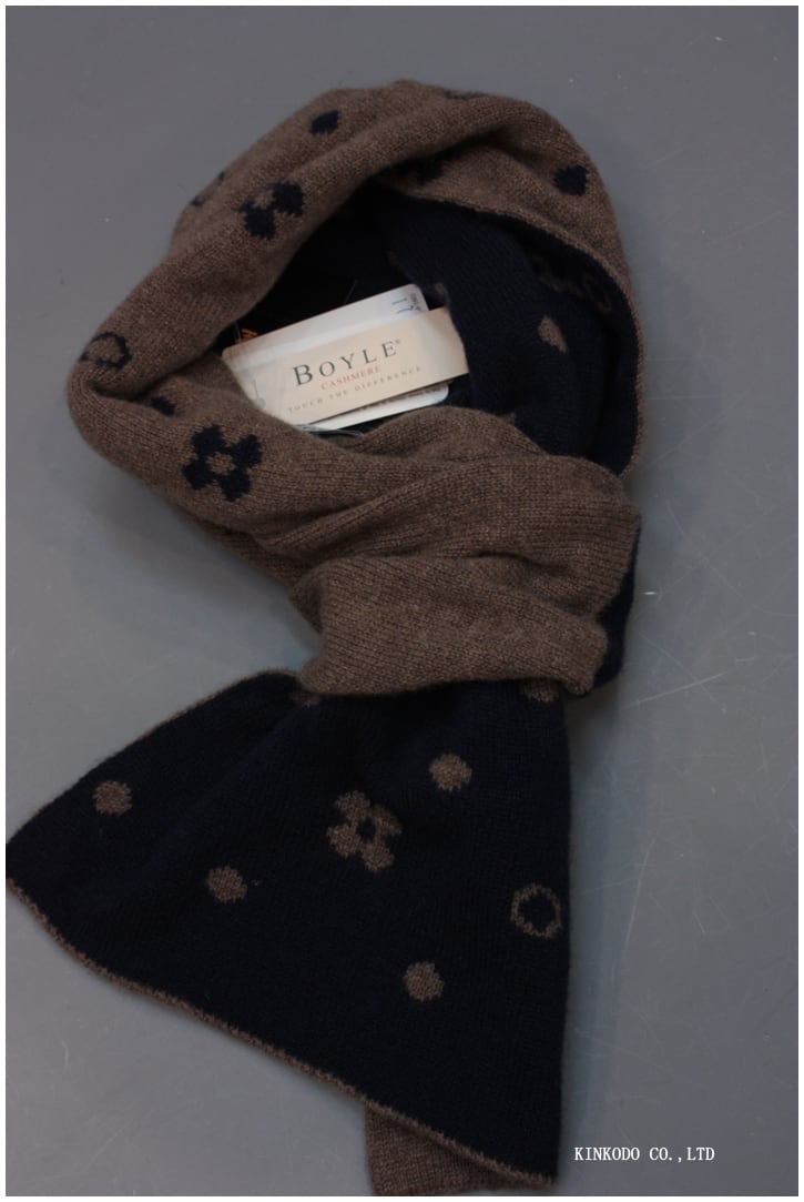 イタリアの BOYLE(ボイル) が手掛けた、カシミヤ100% の2WAYネックウォーマー。ネイビー面とブラウン面で表情が変わるリバーシブル仕様で、コーディネートに合わせて“見せたい面”を選べます。小紋のようなドット&フラワー柄が上品で、ビジネスから休日まで幅広く活躍します。