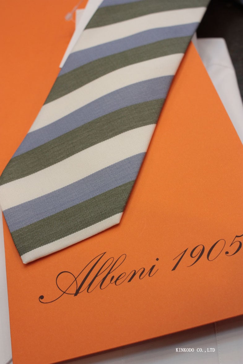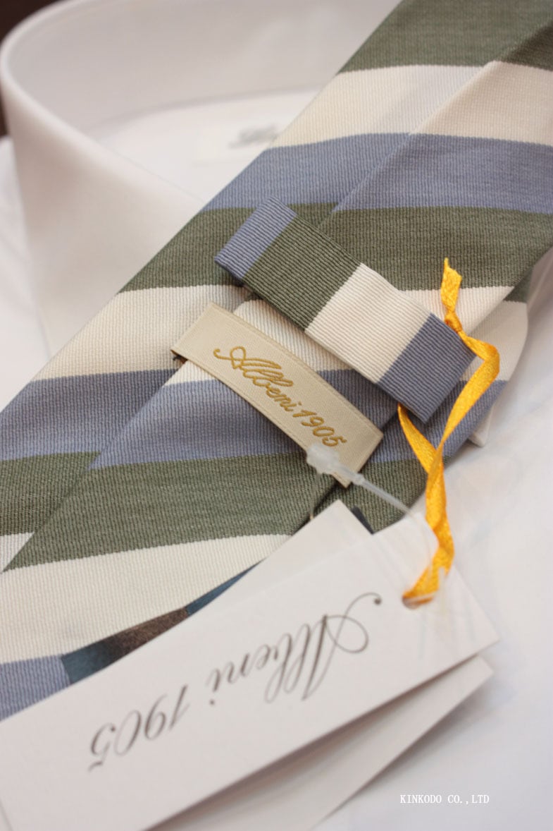 "アルベニ 1905" のタイは、コモ、ビエッラ産の上質な生地を使い、アルティジャンのハンドワークで1本ずつ仕上げられており、滑らかな質感、しっかりとした締め心地が特徴的です。