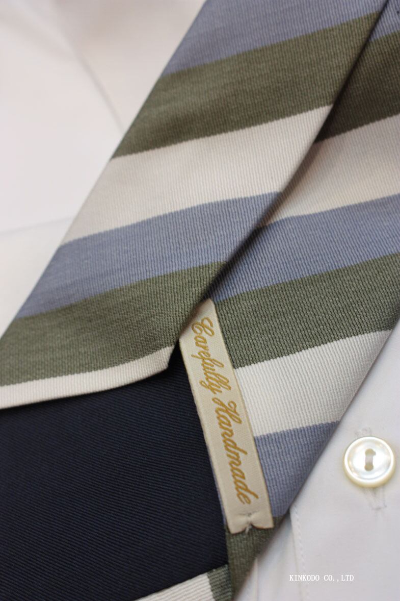 ブルーとグリーンにホワイトを効かせた、**幅広レジメンタル(ワイドストライプ)**のイタリア製ネクタイ。