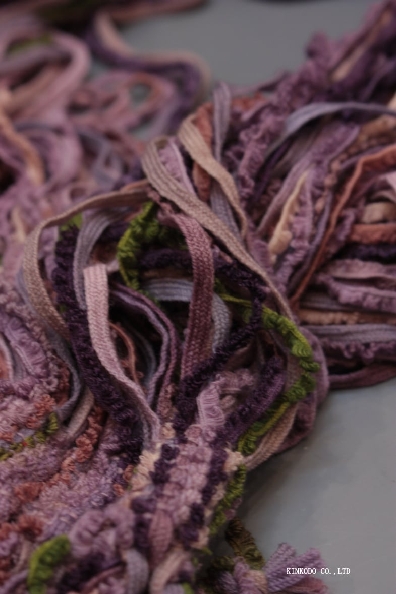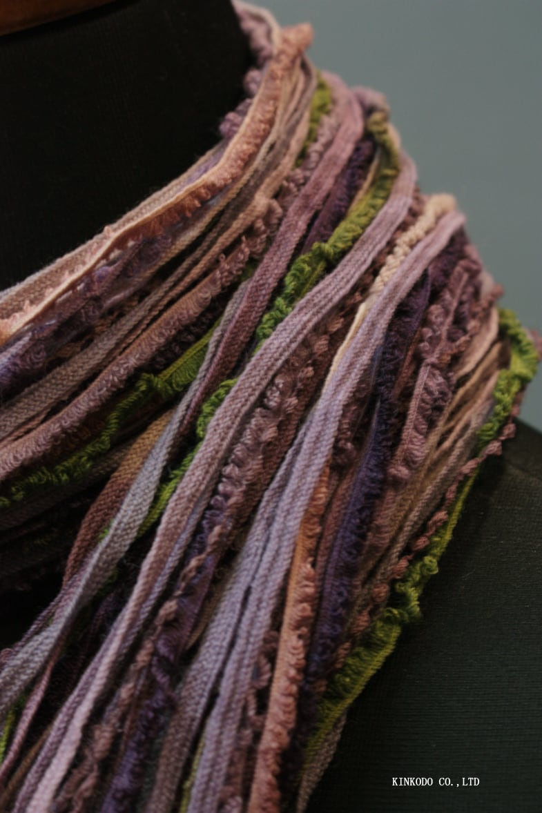 愛知県一宮の織物産地で生産されるウールの紐と出会った時に、その紐をいろんな色に染めて組み合わせることで、従来の織物にはないユニークな表現ができるのではないかと閃き、地元石川を代表する色である、九谷五彩、加賀五彩の色合いに注目し、通常なら染めた紐を織って襟巻にするところを、あえて織らずに、紐が絡まり合う動きの楽しさ、彩りの美しさを最大限活かすべく、カラフルな紐を束ねた紐襟巻を考案されました。