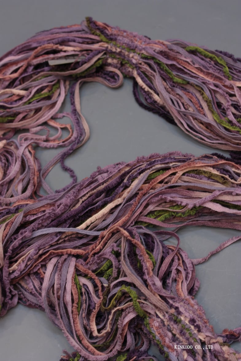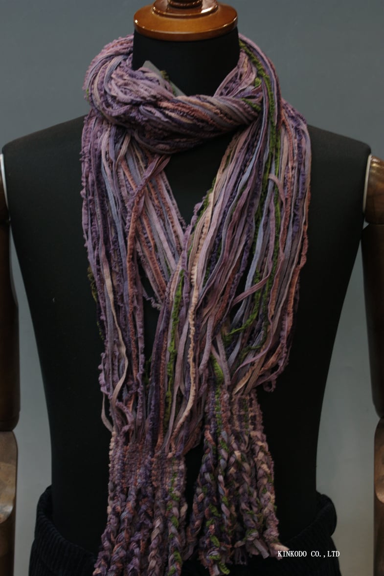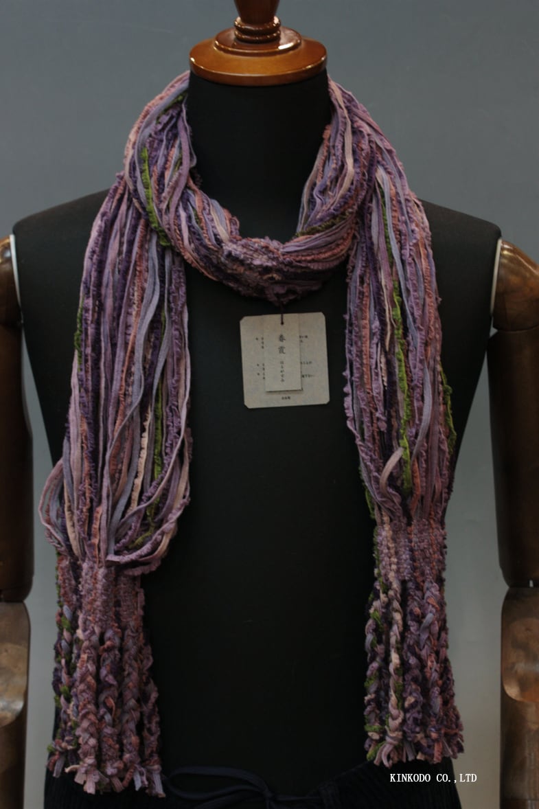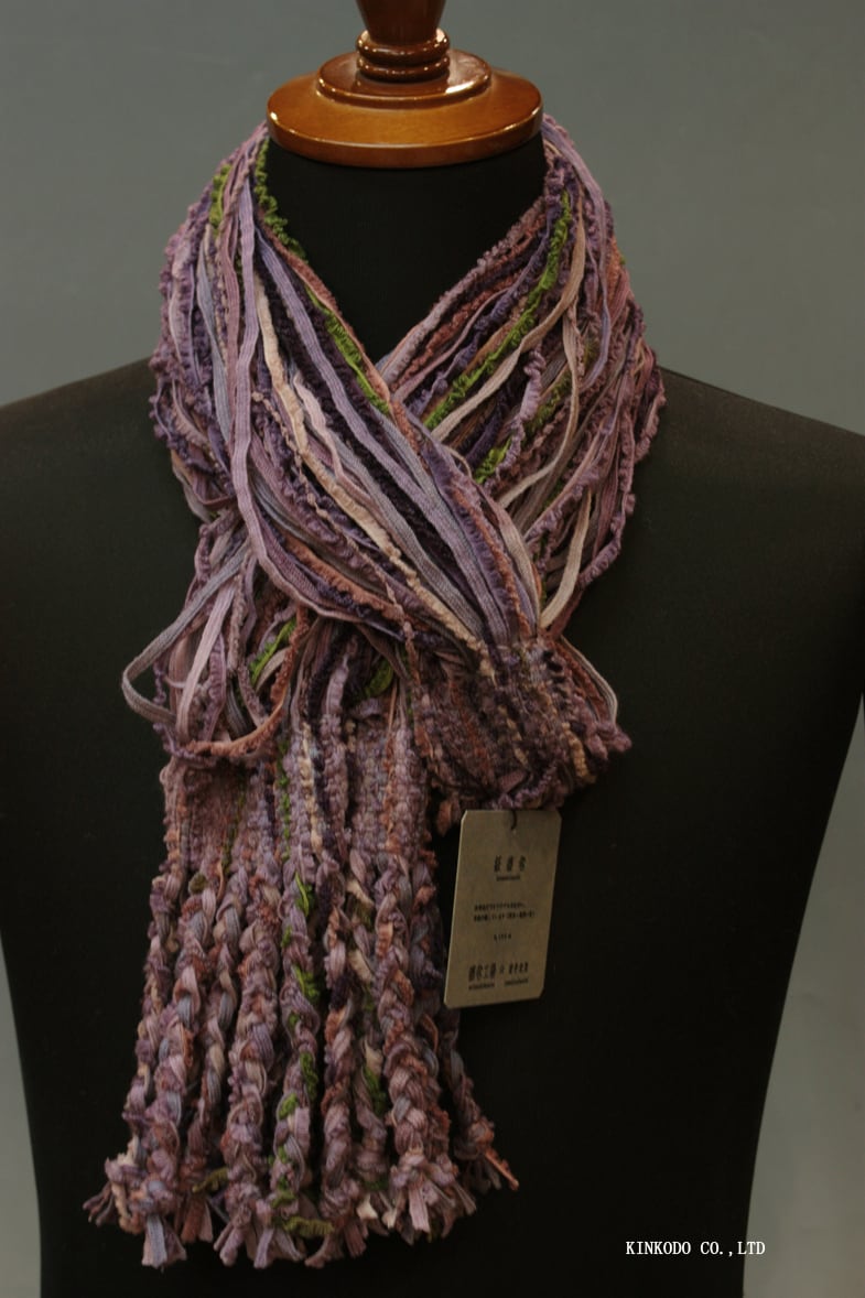 パープルの濃淡とグリーンの紐で構成された春向きの色合いの襟巻きです。