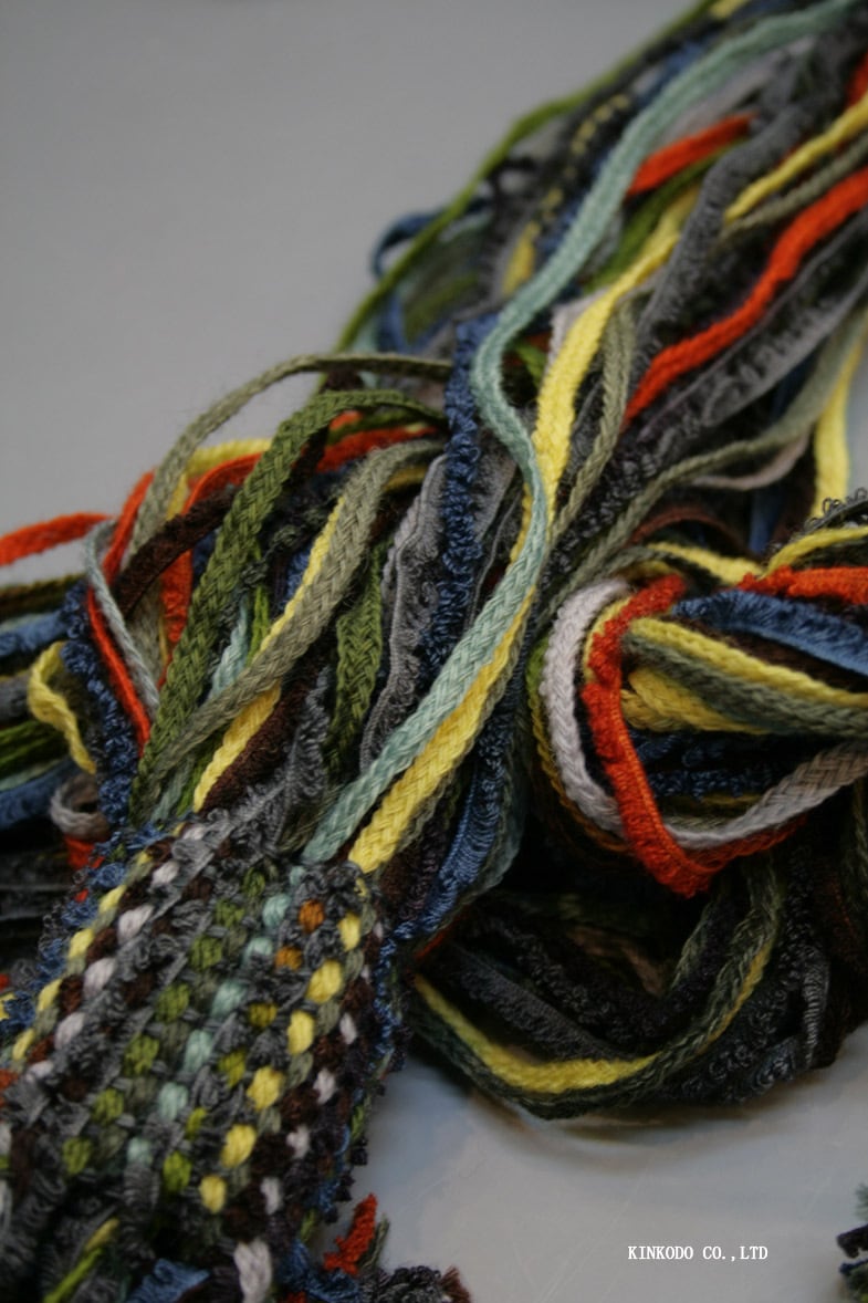 愛知県一宮の織物産地で生産されるウールの紐と出会った時に、その紐をいろんな色に染めて組み合わせることで、従来の織物にはないユニークな表現ができるのではないかと閃き、地元石川を代表する色である、九谷五彩、加賀五彩の色合いに注目し、通常なら染めた紐を織って襟巻にするところを、あえて織らずに、紐が絡まり合う動きの楽しさ、彩りの美しさを最大限活かすべく、カラフルな紐を束ねた紐襟巻を考案されました。
