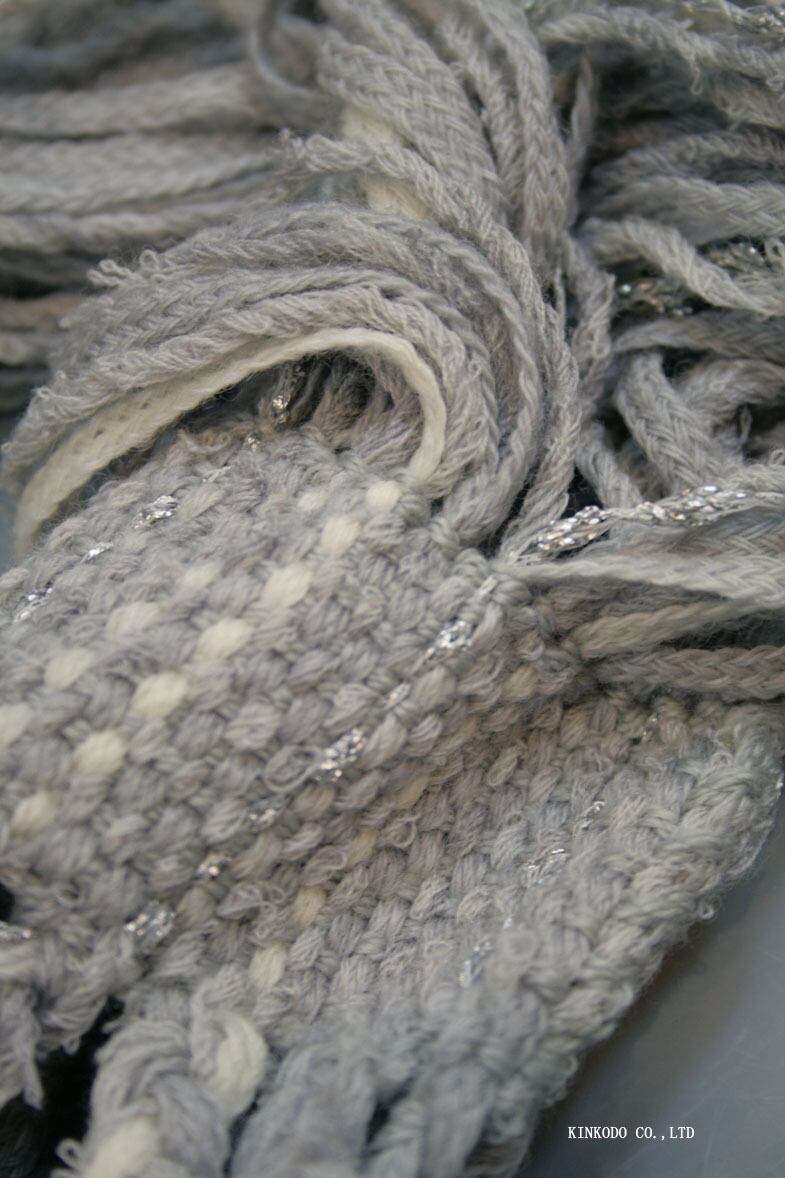 明るいグレーとシルバーの紐で構成された春向きの色合いの襟巻きです。